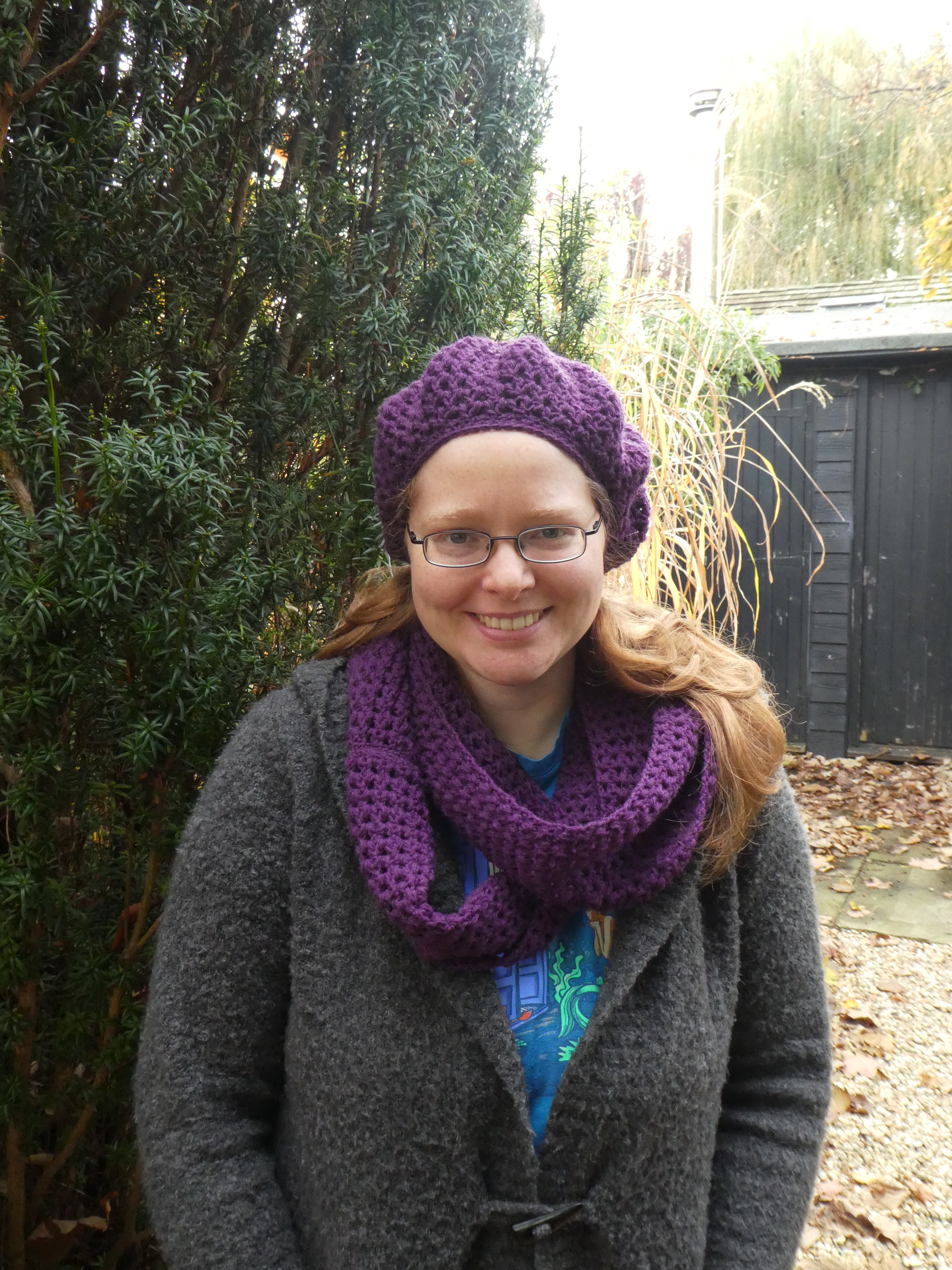 The hat and scarf go just perfectly with my new purple winter coat, and I’ve bought some purple soft deerskin gloves to complete the ensemble.