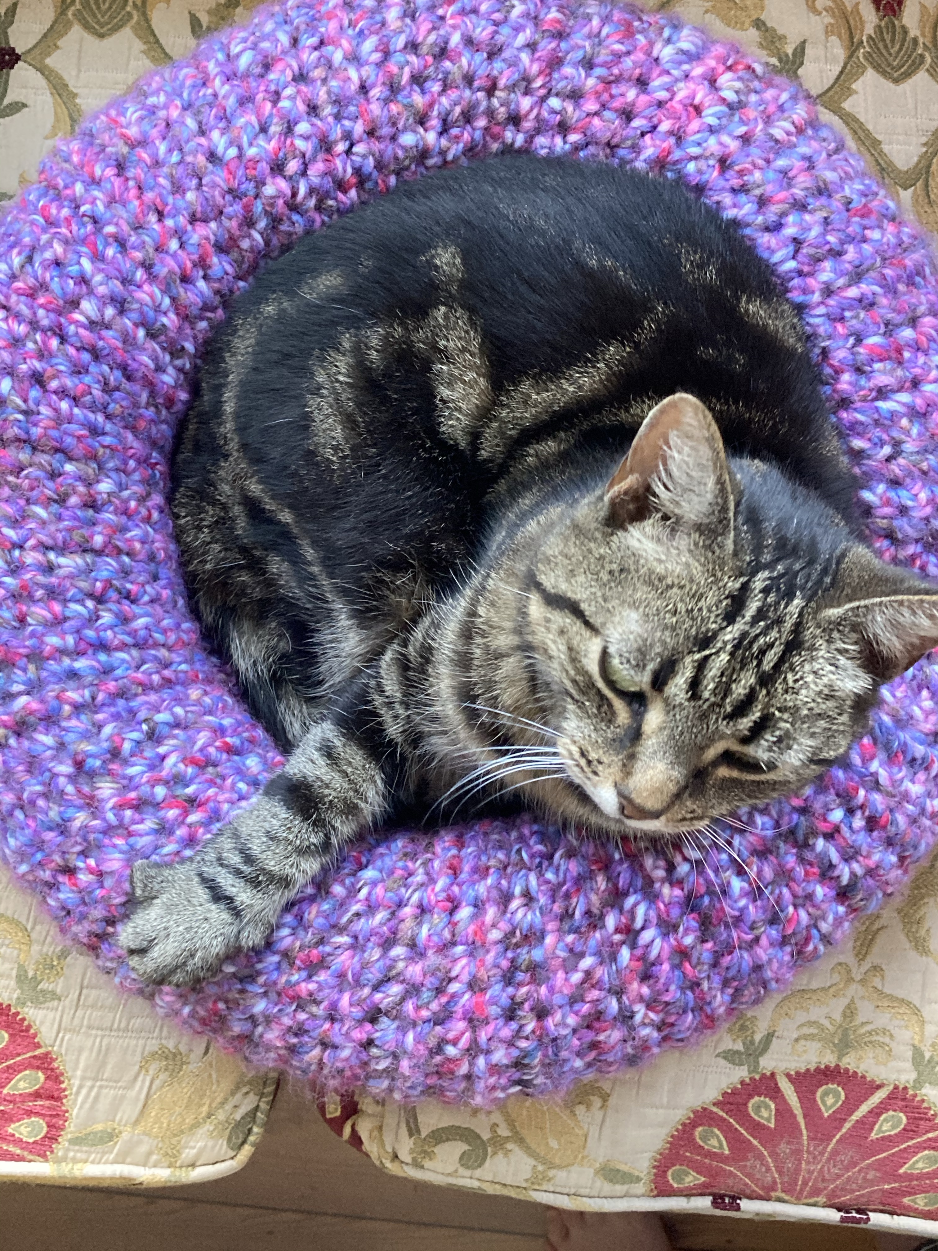 Cat bed – I’ve actually made three of these because we’re getting two new kittens!!! It was only going to be one, but Bumble decided it was hers, thus the duplication. Stylecraft Swift Knit Super Chunky, 12mm hook. It’s basically a circle and a tube. No pattern, I just sort of winged it.