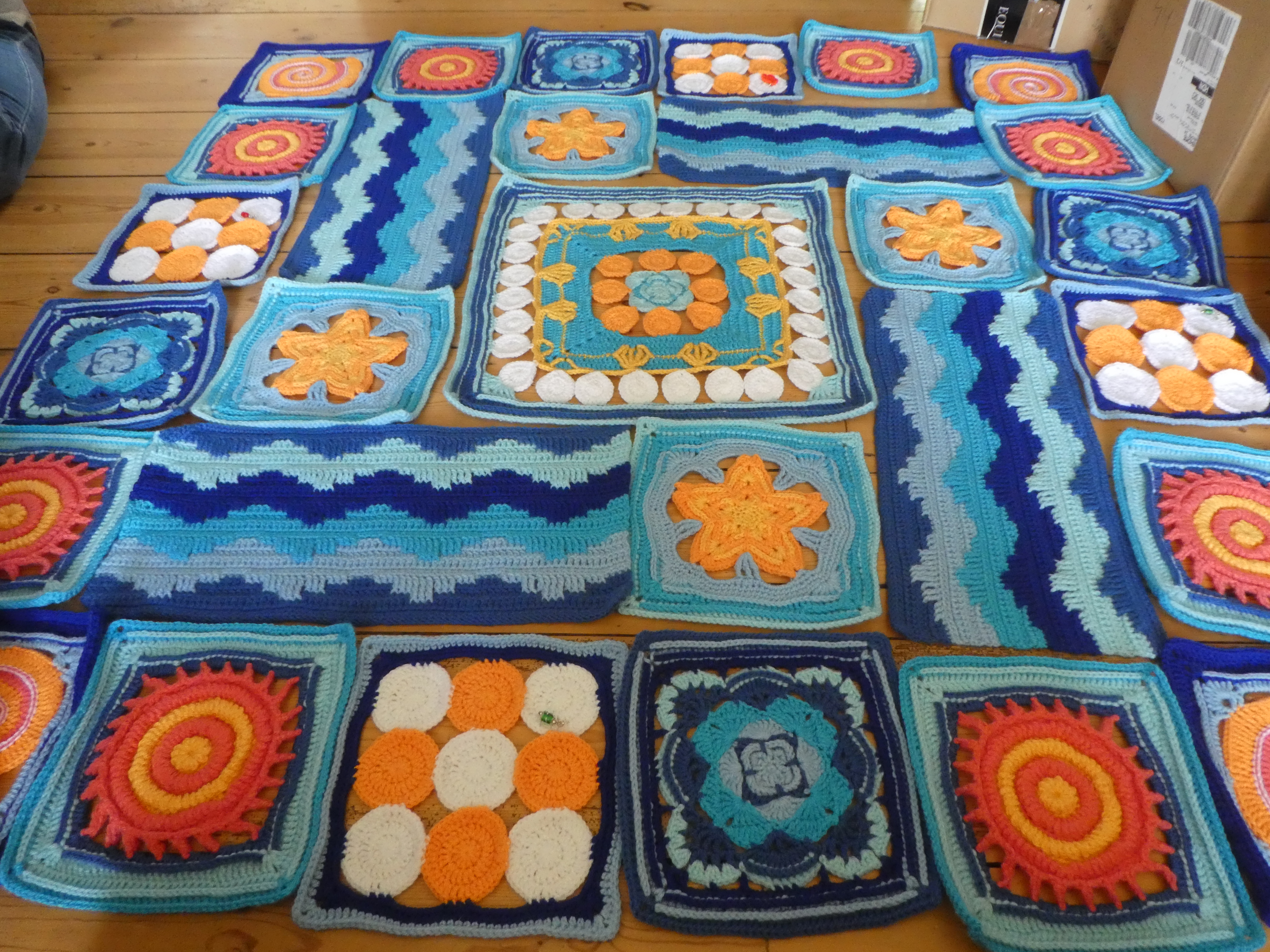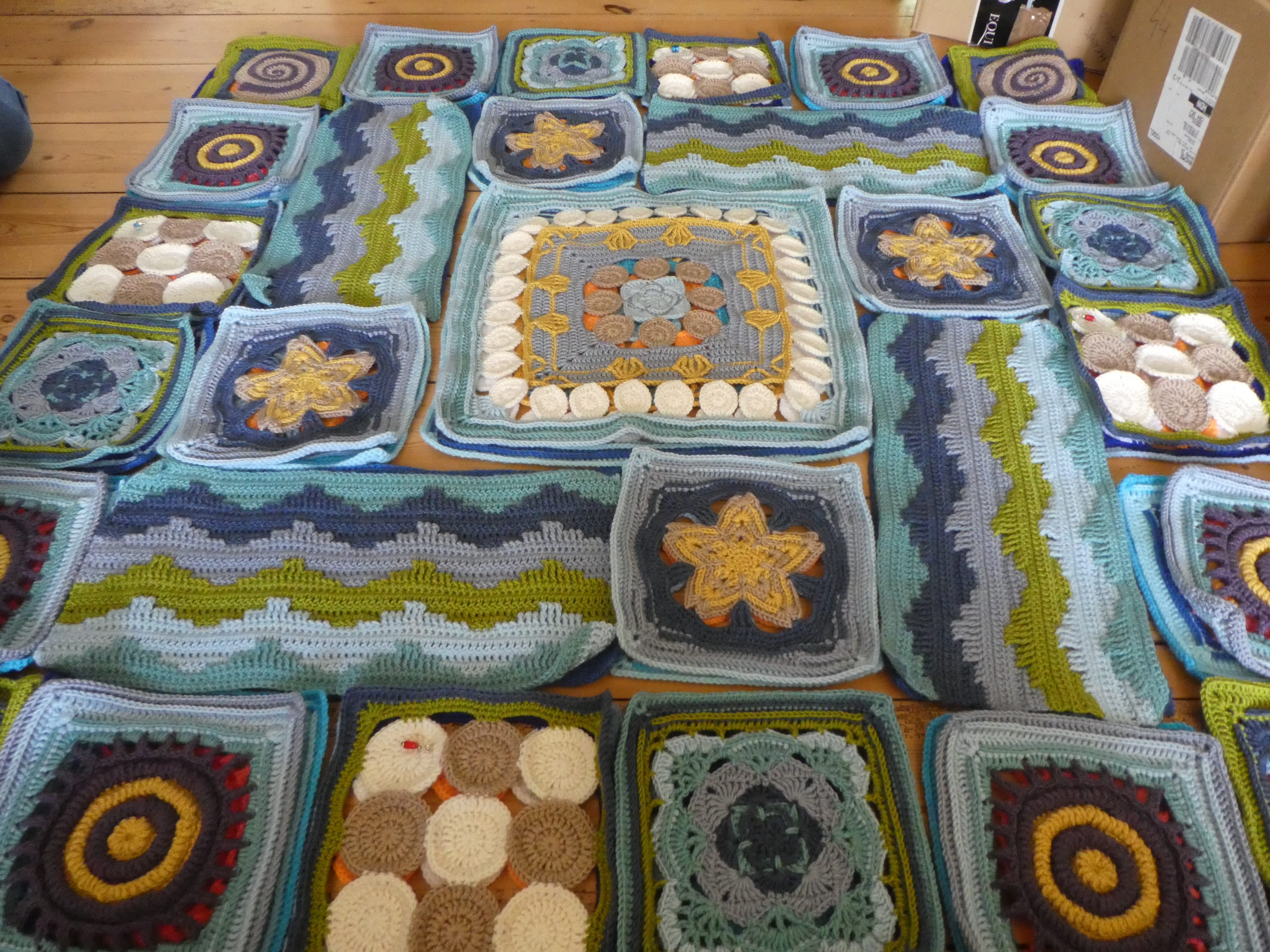 I’m making good progress on my current blankets. So good, in fact, that I thought I’d lay them both out to have a look. There was only one set of squares still to go, laying it out at this stage would be good – right?