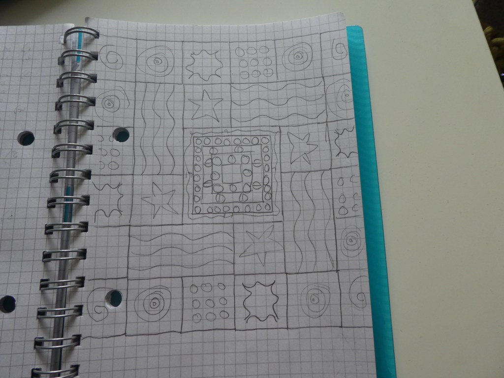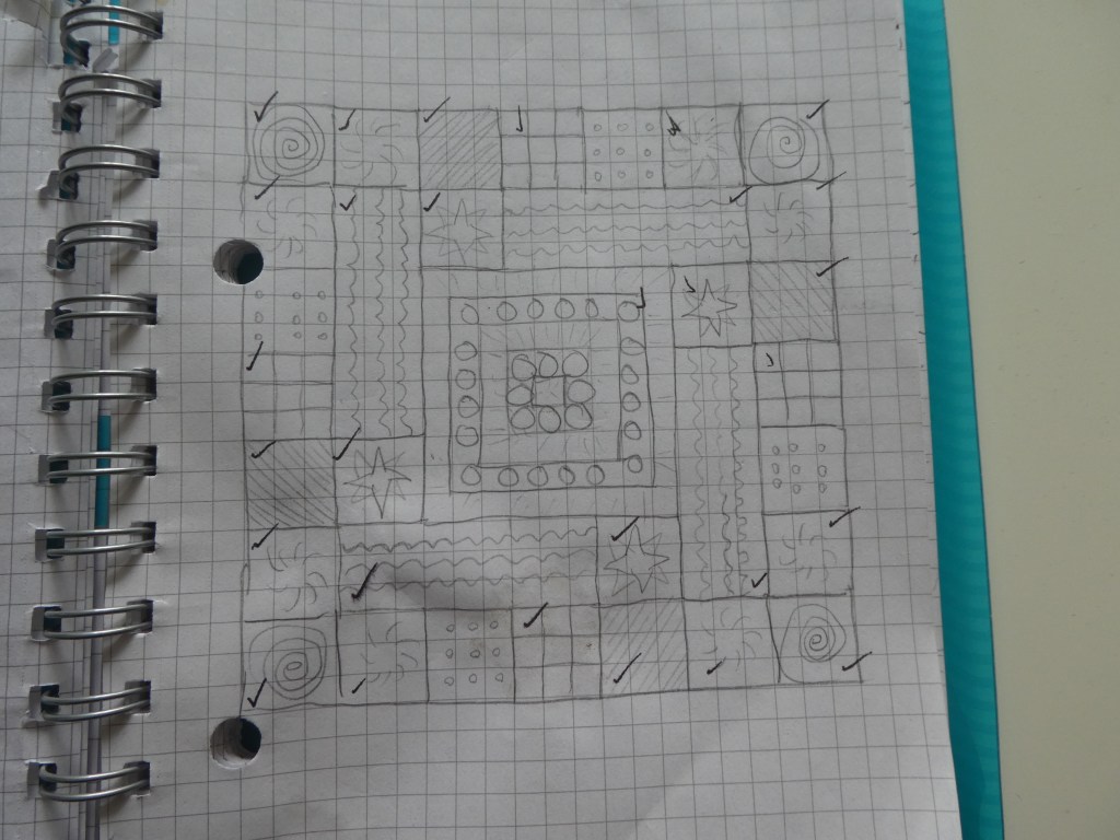 I designed the central square first, 17″ across, then the rectangle, which is quite clearly the same width but half the height of the central square – 17″x8.5″. That means that all the smaller squares had to be 8.5″ too, and there would be six different square patterns.