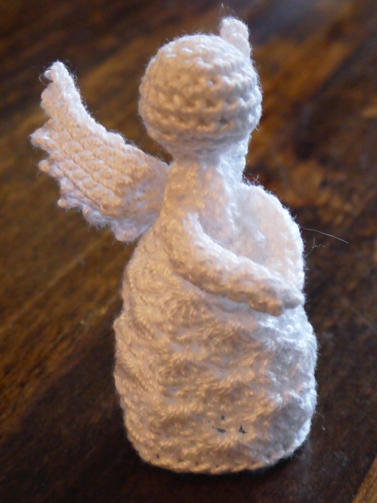 Each angel took me 2-3 hours – it would probably have been quicker with a bigger yarn or a less covid-addled brain 😀 but by and large I enjoyed making them (with one exception, Holly Angel, which I must admit nearly defeated me with the rows and rows of close ruffles), which is the important thing.